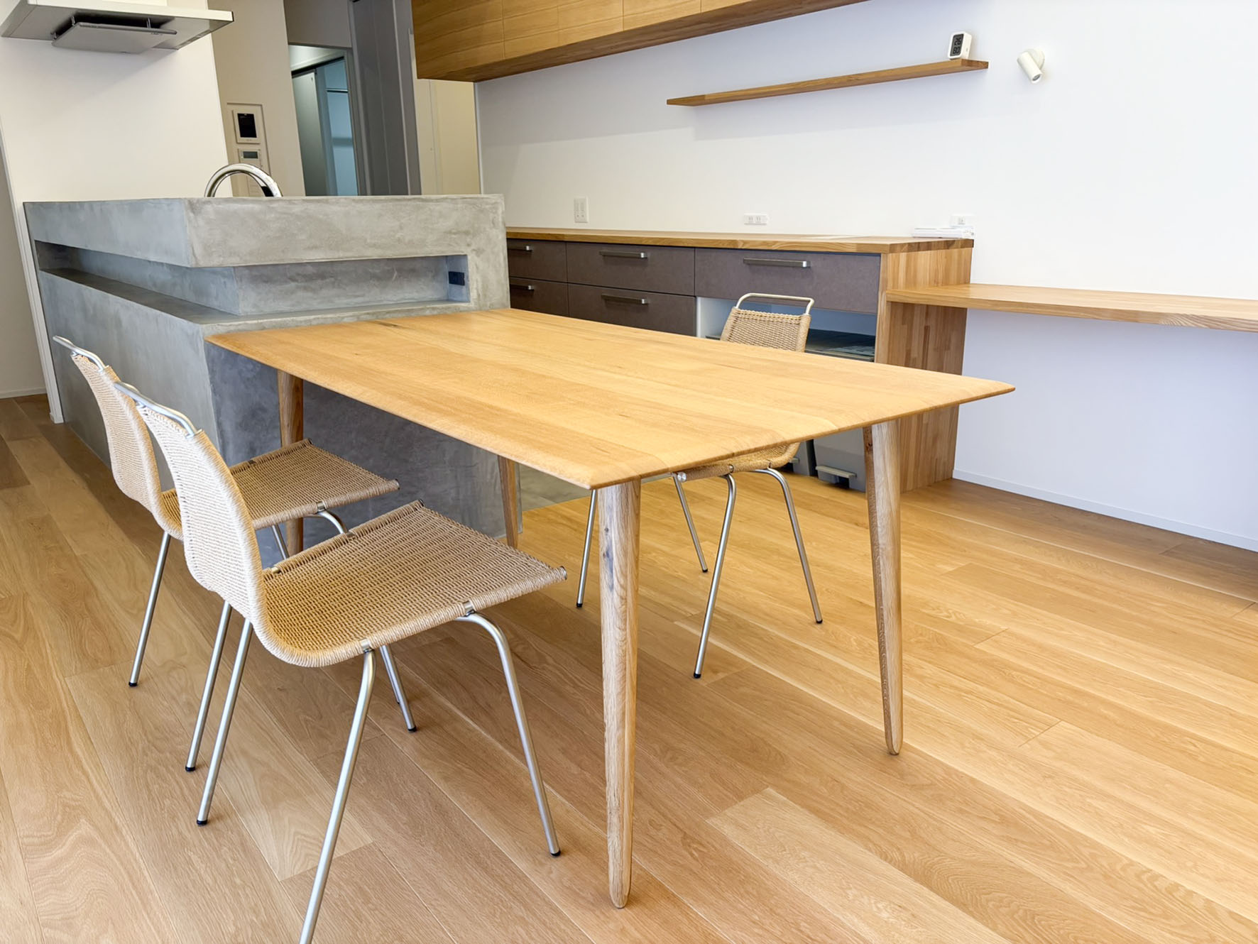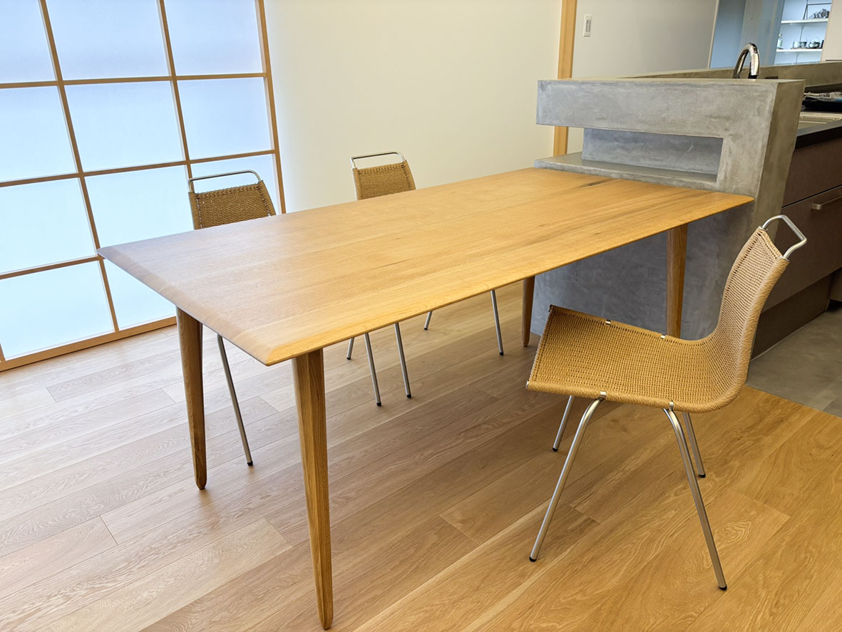 天板や脚に繊細な丸みを持たせたテーブルはオーク無垢材。