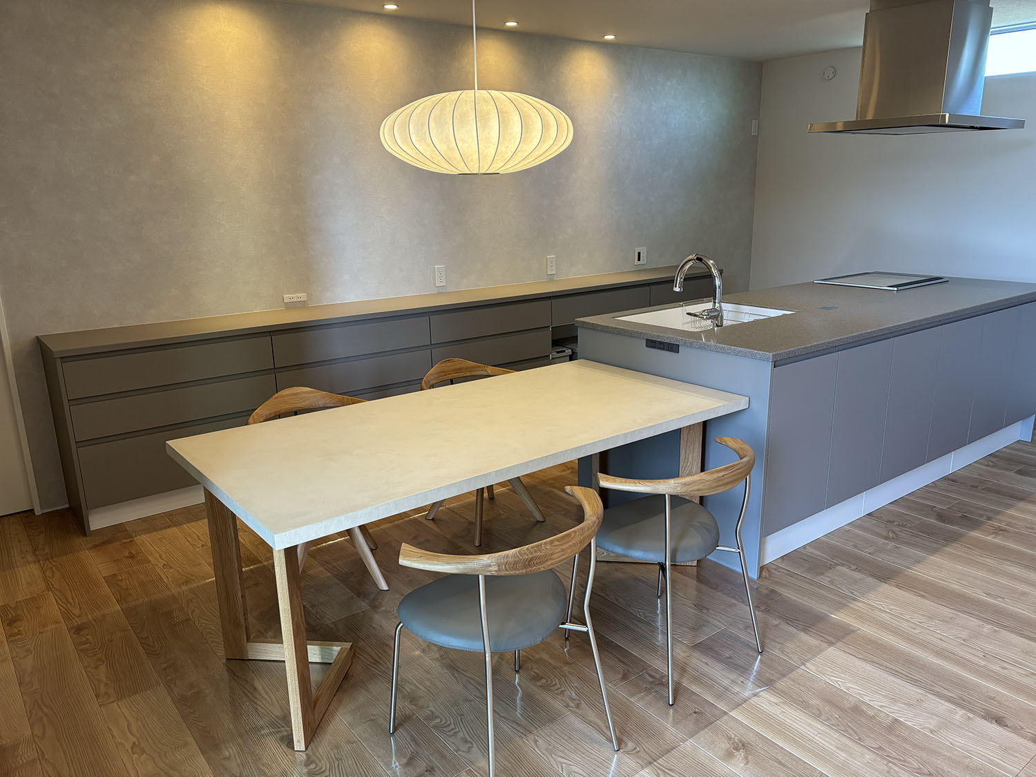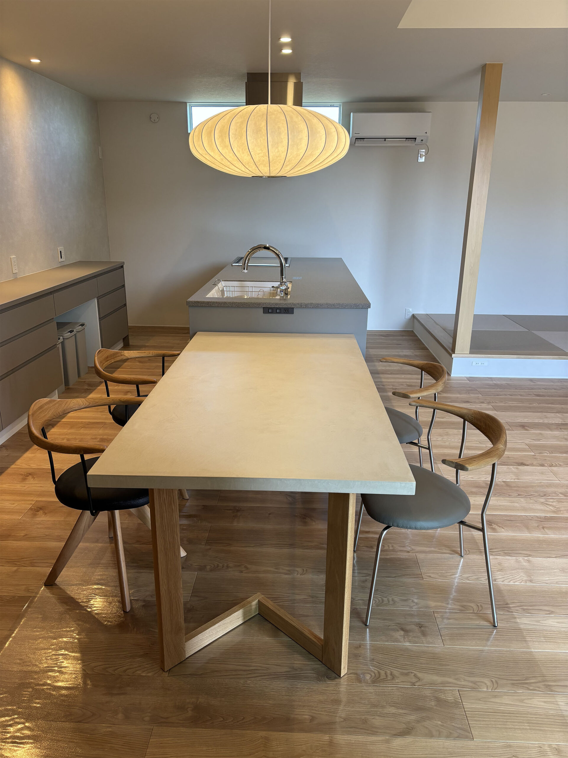 モールテックスの質感が際立つダイニングテーブルは、オーク無垢材の脚との組み合わせによって素材の温かみとシャープがポイントに。
